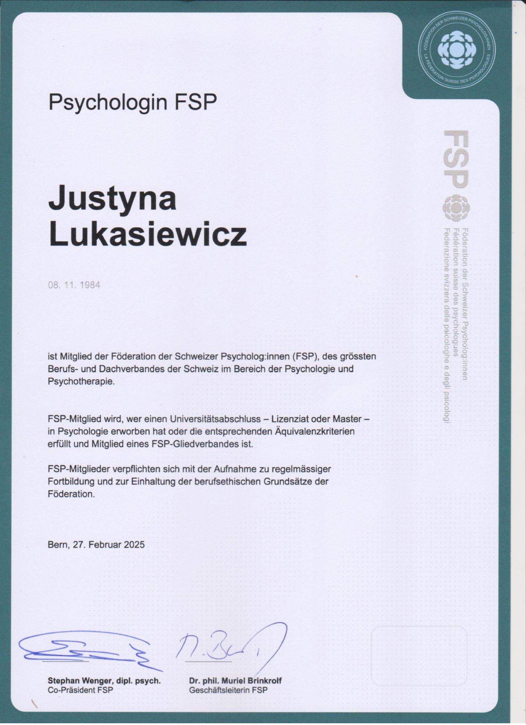 Ich bin Psychologin und arbeite mit Kindern, Jugendlichen und Erwachsenen. Zudem bin ich Mitglied der Föderation der Schweizer Psychologinnen und Psychologen (FSP) sowie Trainerin für Sozialkompetenztraining (SKT).